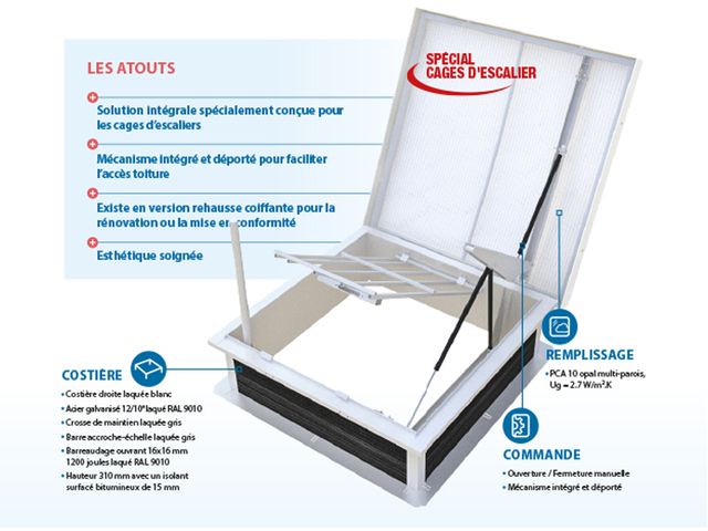 Le PYROPASS est un exutoire de fumées spécialement conçu pour les cages d'escalier, visant à garantir sécurité et accès optimal à la toiture. Adapté aux toitures terrasses dotées d'étanchéité, il allie design esthétique et performances techniques pour une ventilation supérieure. Disponible en deux gammes distinctes, Origin' et Thermik', ce produit s'ajuste à divers besoins grâce à ses options d'ouverture manuelle.
