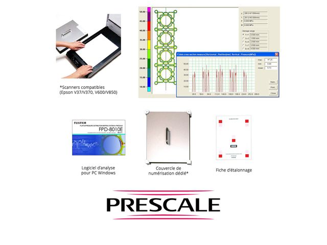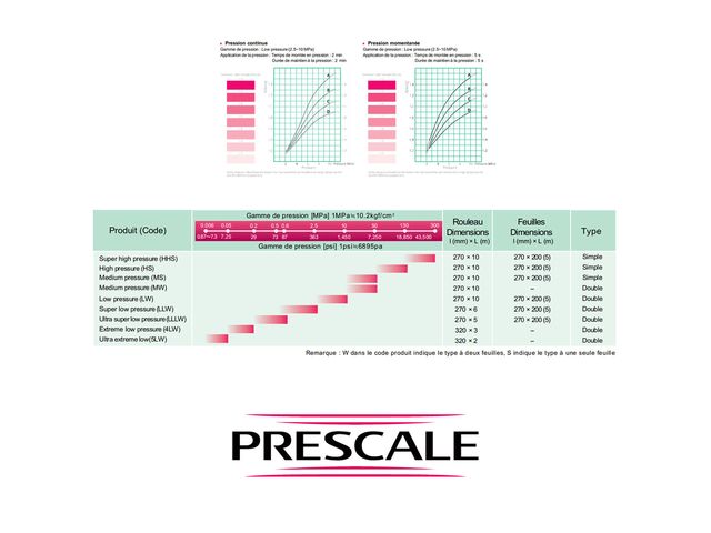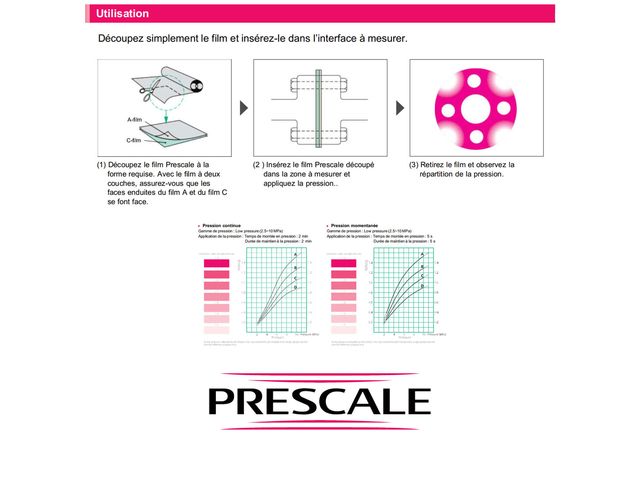 “ L'utilisation du film de mesure Prescale est très simple : 1 - Découpez le film 2 - Appliquez la pression 3 - Observez l'empreinte Evaluez ensuite la pression en comparant l'intensité de la coloration avec l'abaque fourni ou en utilisant le système de mesure dédié FPD-8010E. ”