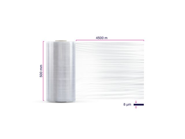 Largeur : 500 mm Longueur : 4500 m Matériau : LLD-PE Recyclable : 100% Type : Film cast ultra fin Utilisation : Pour filmeuses semi-automatiques et automatiques Épaisseur : 8 µm Étirabilité : Jusqu'à 340%