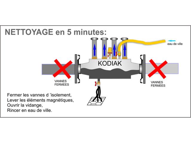 2. Facilité d'utilisation: Le nettoyage du filtre ne requiert aucun démontage ou ouverture de la cuve, évitant ainsi le désagrément de salir le sol ou d'introduire de l'air dans l'installation. Cette facilité s'explique par l'innovation du relevage des aimants assisté et du gicleur de nettoyage breveté par KODIAK.