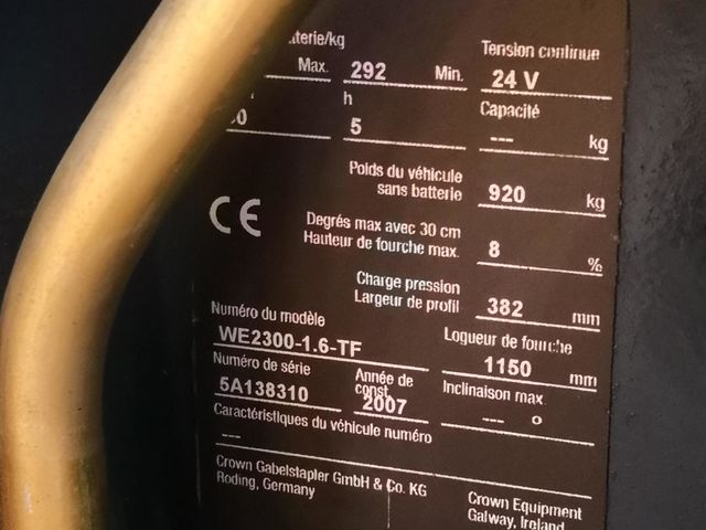 Capacité de levage jusqu'à 1.6 tonnes - Grâce à sa capacité de levage notable, le gerbeur Crown WE2300 permet de manipuler en toute sécurité des charges importantes, ce qui en fait un choix stratégique pour les environnements industriels exigeants.