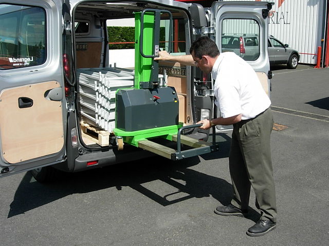 Avec une levée soit manuelle soit électrique (moteur 12V-0.8 Kw), il monte sans effort dans un véhicule avec ou sans charge sur les fourches !