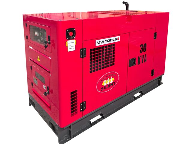 Groupe électrogène diesel 33 kVA en 3x400 V et 1x230 V, équipé d'un raccordement pour réservoir de carburant externe.