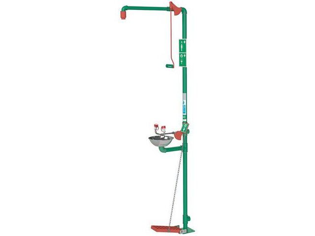 En cas d'urgence, tirez la poignée de la douche. L'eau commencera à couler immédiatement de la tête de douche et du laveur d'yeux. Maintenez-vous sous la douche et/ou utilisez le laveur d'yeux pendant au moins 15 minutes, ou selon les recommandations des fiches de données de sécurité de la substance dangereuse concernée. Assurez-vous que la zone autour de l'équipement est dégagée et que la sortie d'eau n'est pas obstruée. Un entretien régulier selon les préconisations du fabricant est recommandé pour garantir le bon fonctionnement du système. La température de l'eau peut être régulée si l'équipement est connecté à une source d'eau tempérée.