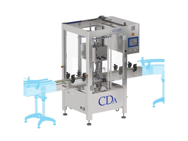 Puis, c’est la visseuse VS1000, entièrement cartérisée, qui prend en charge plusieurs types de bouchons : bouchons spray, bouchons pipettes, bouchons pistolets, etc.
