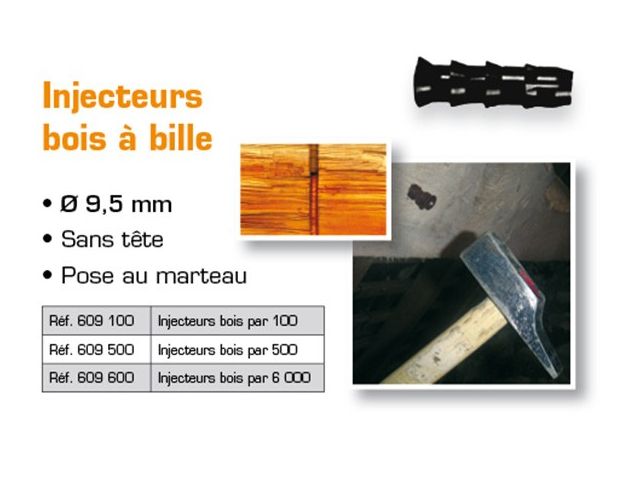 Type : Injecteurs bois à bille Diamètre : Ø9.5 mm Configuration : Sans tête Méthode de pose : Pose au marteau Matériau : Bois Conditionnement : Lot de 500 injecteurs Application : Utilisé pour injections dans le bois Usage : Industries et services associés