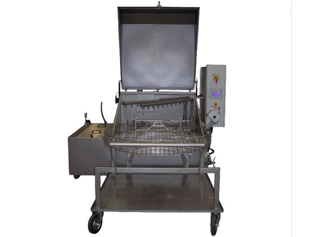 Lavage par aspersion continue : Les pièces sont nettoyées via un panier rotatif et des tuyaux d'arrosage diffusant un mélange d'eau et de savon.