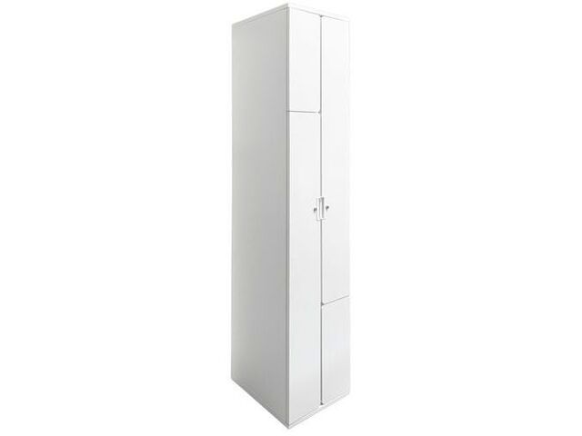 Ce modèle spécifique inclut une fonction penderie, permettant de suspendre des vêtements longs, ce qui le rend particulièrement fonctionnel pour le rangement de tenues de travail ou de sport. Avec une largeur totale de 900 mm, une hauteur de 1850 mm et une profondeur de 450 mm, il offre un volume de rangement généreux tout en conservant une empreinte au sol optimisée. La largeur de chaque colonne de 300 mm assure un espace suffisant à l'intérieur de chaque casier.