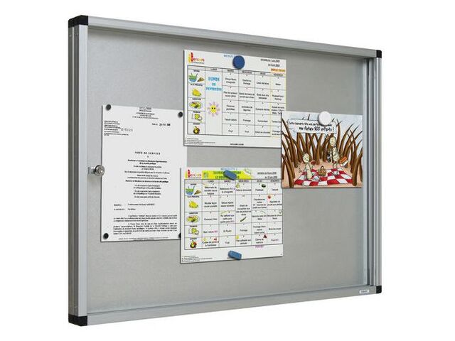 La surface d'affichage magnétique de cette vitrine est dotée d'un fond en acier argenté, permettant d'accrocher facilement des documents, des affiches ou des notes à l'aide d'aimants. La capacité de 21 feuilles A4 vous offre un espace de présentation suffisant pour vos communications essentielles. Les deux portes coulissantes en verre trempé garantissent la sécurité de votre contenu tout en assurant une visibilité optimale. Le système de fermeture assure une protection efficace contre le vol et les manipulations non désirées, ce qui est particulièrement utile dans les environnements où la confidentialité est importante.