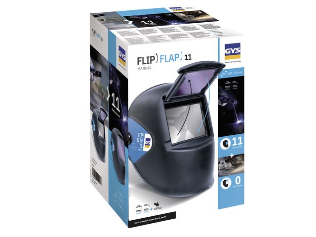 Destiné à protéger le visage et les yeux du soudeur, le masque FLIP-FLAP est équipé d'une fenêtre relevable teintée 11 permettant une vision de soudage claire ainsi qu’une fenêtre fixe transparente pour assurer la vision hors soudage ou meulage.