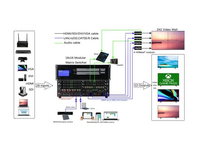 1. Flexibilité incomparable : Dotée de 9 emplacements pour cartes, la SHM2-3600 offre la possibilité de gérer jusqu'à 36 entrées et 36 sorties. Elle est compatible avec les signaux analogiques et numériques, ce qui vous offre une grande diversité dans l'utilisation de différents formats : VGA, CVBS, HDMI, SDI, HDBaseT, Fibre Optique. Sa modularité vous offre une adaptabilité hors pair, vous donnant la liberté de switcher entre différents formats sans contraintes.