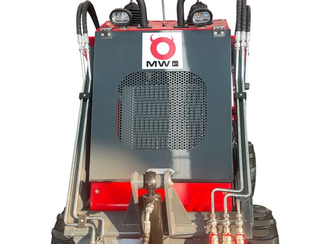 - Mini chargeur 380 kg sur roues avec 3 pompes hydrauliques (ref MLD380R) adapté à l'utilisation d'outils hydrauliques plus lourds.