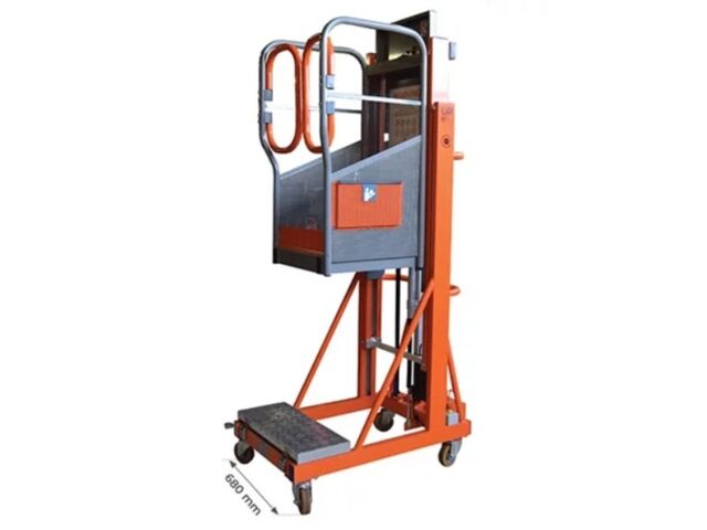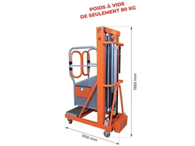 Offrant une hauteur de travail allant jusqu’à 5 m, cet équipement de levage est capable de supporter une charge maximale de 120 kg. Sa plateforme, mesurant 690 x 480 mm, est équipée d'une plinthe et d'un garde-corps assurant une sécurité optimale contre la chute de personnes et de matériaux.
