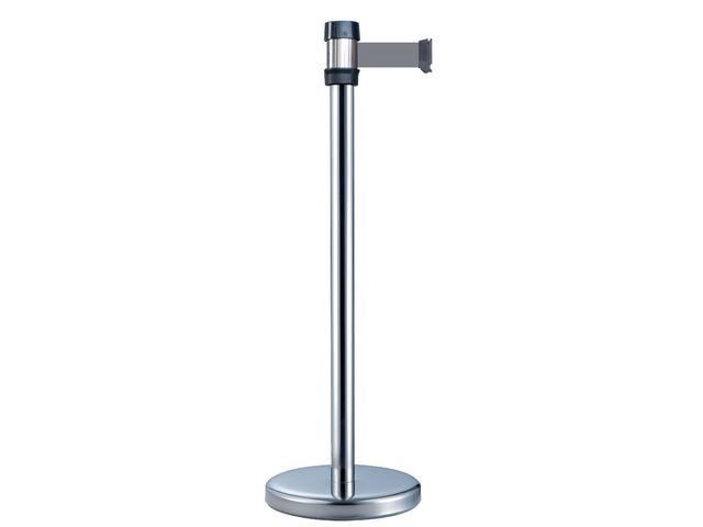 Poteau avec pied rond et ruban étirable de 2 mètres. Poteau disponible en noir avec ruban noir ou en version chromée avec ruban gris ou noir.