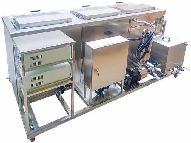 Nettoyeur ultrasons avec 2 cuves ultrasons de 60 litres, 1 cuve de séchage 60 litres et un système de filtration. Adapté à une utilisation industrielle en continu 24/7.