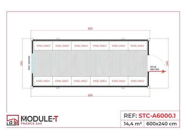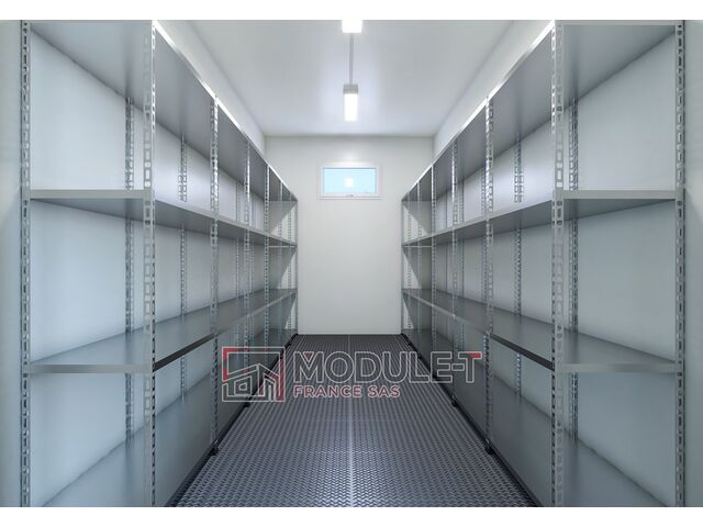 Bungalow de stockage avec rayonnages métalliques intégrés - 600 x 240 cm | STC-A6000.1 - MODULE-T FRANCE