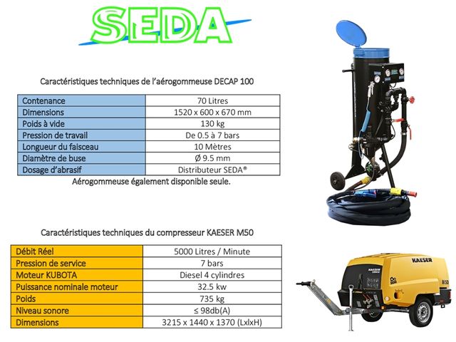 Capacité de cuve : 70 litresCompresseur : KAESER M50Consommation d'air : 5000 litres/minuteDiamètres de buse (standard) : 9.5 mmLongueur du faisceau : 10 mètresPoids du compresseur : 735 kgPoids à vide : 130 kgPression de service du compresseur : 7 bars