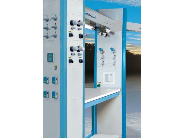 Les paillasses Infinity sont équipées de colonne avec utilités service de forme carrée ou triangulaire, des barres de liaison transversales, des panneaux pour fluides, eau et électricité, une paillasse mobile sur roulettes et des dispositifs d’extraction.