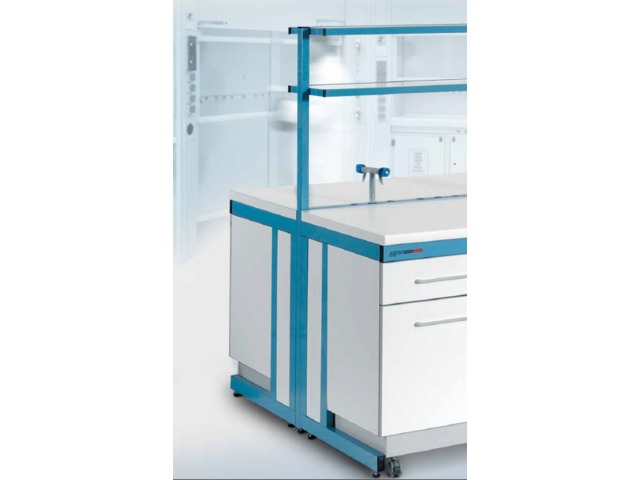 Pour un meilleur rangement, les paillasses de la série RIC 1000 sont équipées d’étagères avec une structure métallique identique à l’ossature centrale et un plateau en verre securit stratifié ou tempéré.