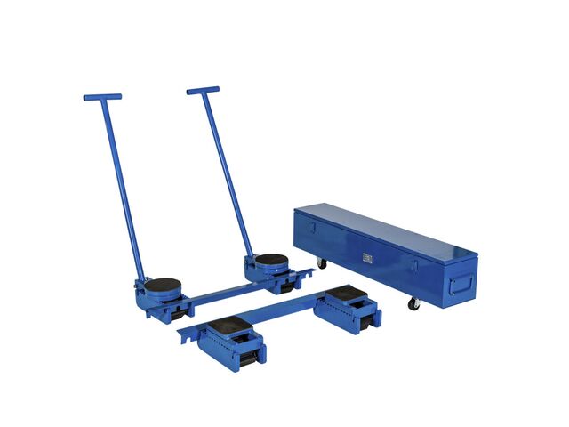 Kit rouleur pour le déplacement de charges jusqu'à 60 tonnesConçu pour se déplacer en toute sécurité des charges lourdes sur de courtes distances, ce kit est idéal même sur des surfaces irrégulières.Fabriqué en acier et revêtement d'une peinture époxy bleue, il comprend tous les éléments nécessaires pour un transport efficace : 2 Timons pour tirer et manœuvrer les charges 4 roulettes équipées de chenilles en acier 2 platines pivotantes à fixer sur les roulettes 2 cales d'ajustement pour garantir une hauteur homogène 2 cornières d'accouplement 1 boîte de rangement sur roulettes pour un transport facileConseils d'utilisation Pour un meilleur déplacement, il est recommandé de prévoir un rayon de braquage d'au moins 3 mètres et de ne pas dépasser une vitesse de 5 mètres par minute.