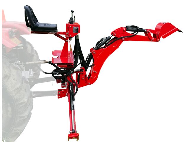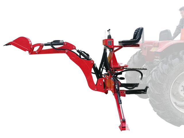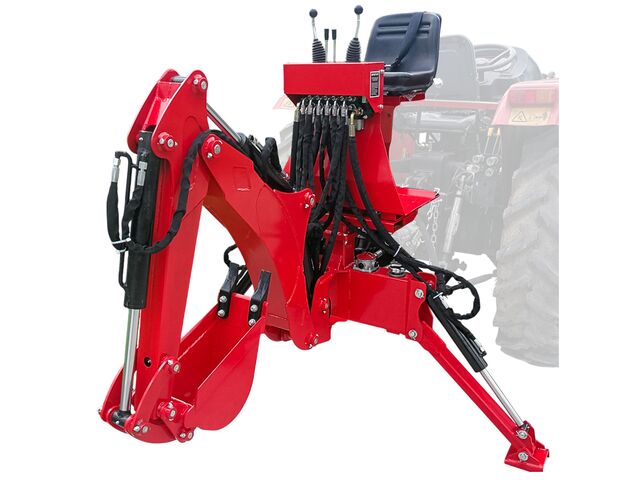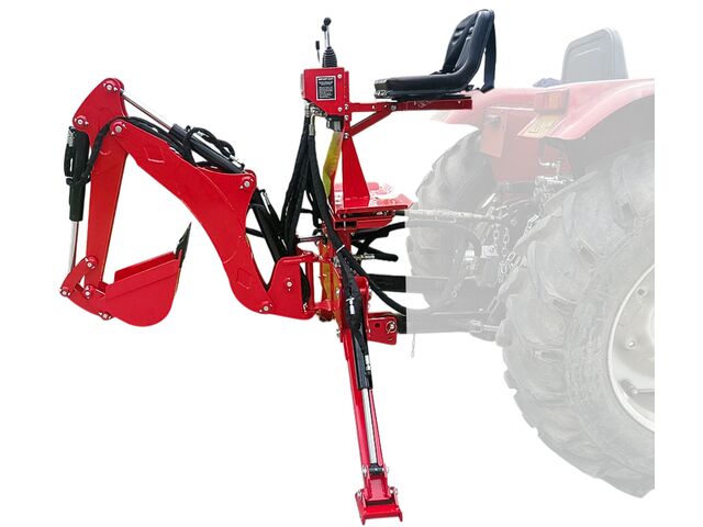 Rétro-pelle avec profondeur de fouille de 1 830 mm et rotation latérale de 180°, conçue pour une utilisation sur tracteurs équipés d'une prise de force (PTO).