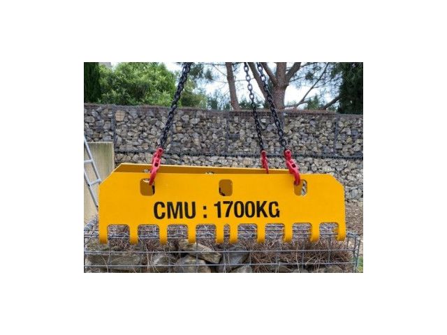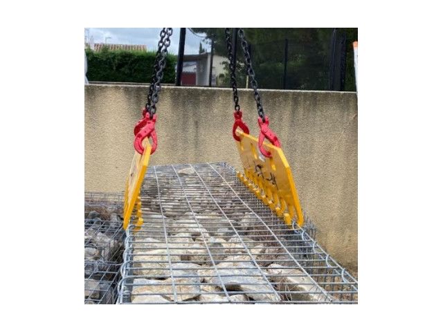 Crochets de levage pour gabions (prix à la paire)Modèle standard ici présenté mais réalisable totalement sur mesures selon vos gabionsLe prix peut donc évoluer, à la hausse ou à la baisse, selon le poids et les dimensions de vos gabions, nous consulter pour devisPlan pour acceptation fourni à la commande (fabrication CE sans soudures portantes dans notre atelier de Moselle) Caractéristiques du modèle ici en vente : - capacité : 1700kg - longueur : 800mm - ouverture / largeur doigts : 75mm / 25mm