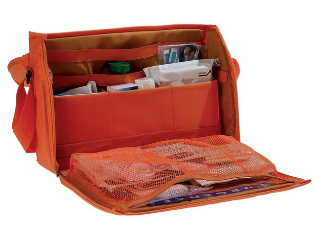 Pochette souple en nylon rouge. Contenu : - 1 couverture de survie - 5 compresses stériles - 1 rouleau de sparadrap - 2 bandes de gaze - 2 bandes extensibles - 10 pansements adhésifs assortis - 4 clips de fixation pour bande - 2 compresses alcoolisées 70° - 2 compresses à la chlorhexidine - 2 compresses anti-coups - 2 sachets anti-brûlure - 2 sachets de gel bactéricide - 1 paire de ciseaux - 1 pince à échardes - 1 paire de gants vinyle - 1 guide de premiers secours en 6 langues
