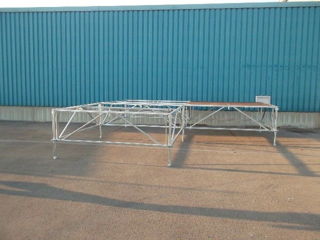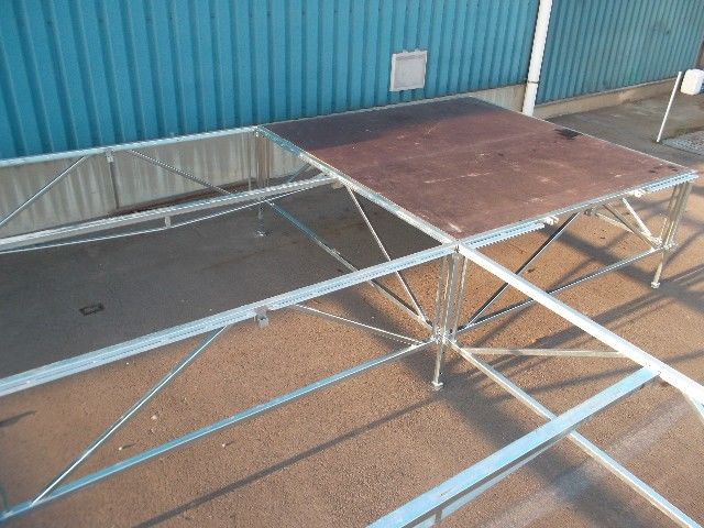 En outre, le monte et démonte du podium se fait rapidement et sans complication, résultante de sa conception modulaire. Il possède un épaisseur de 21 mm avec des dimensions par élément de 122 x 244 cm. En option, des marches d'escalier de 90 x 23 cm peuvent être ajoutées pour faciliter l'accès à la scène.