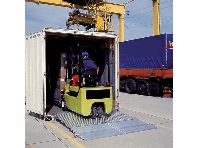 “ Pont de chargement robuste, pliable et amovible pour charges lourdes, en acier galvanisé. Idéal pour décharger des containers. Comprend 2 chaînes de sécurité pour accrocher le pont au container. Largeurs : 2000 ou 2300 mm & Charge [...] ”