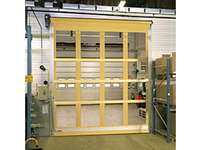 La porte rapide Crawford 1200 est conçue pour des ouvertures intérieures moyennes avec une vitesse de vent jusqu'à 11 m/s et où une grande visibilité est nécessaire. Le tablier de la porte rapide Crawford 1200 est en PVC d'une épaisseur de 1.5 mm entièrement transparent sauf les bandes d'avertissement qui sont en vinyl renforcé. La transparence donne une excellente visibilité et contribue à un environnement de travail sécurisé. Le tablier de porte comporte des traverses en aluminium intégrées pour résister à la pression de l'air et à des forces de vent modérées. Tous les panneaux peuvent être remplacés.