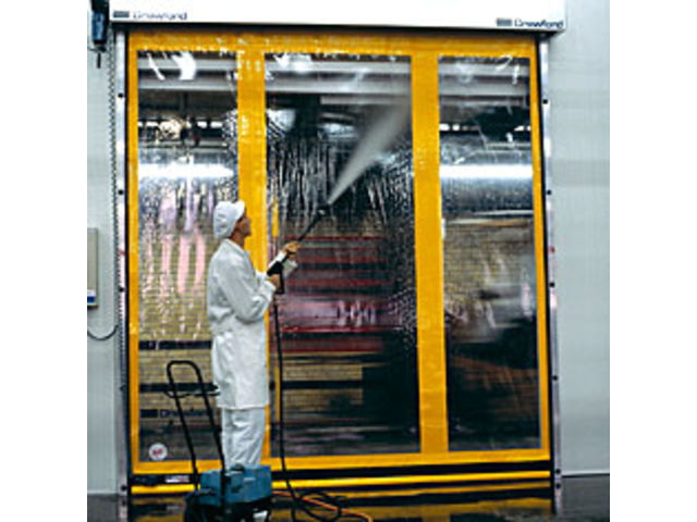 La porte rapide 500H Crawford est spécialement conçue pour de petites ouvertures de baie et pour des applications où l'hygiène est primordiale. Afin de répondre à des besoins de nettoyage régulier, les composants de la porte sont en acier inoxydable AISI 316 et en PVC.