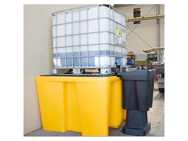 Poste de soutirage en PE pour bac de rétention avec sortie de vidange et débordement du trop plein dans la palette de rétention.