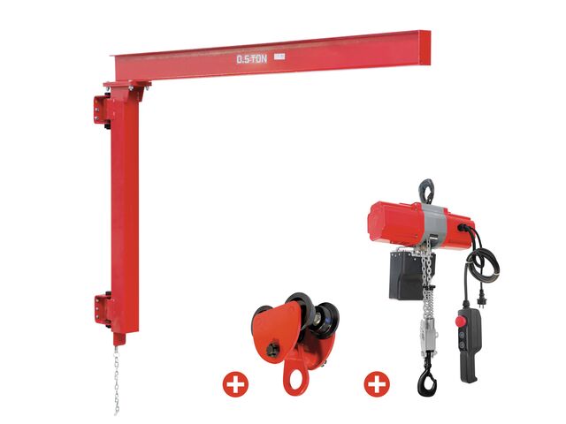 Pack avec potence murale pivotante 500 kg, palan électrique à chaîne 6 m et chariot manuel.