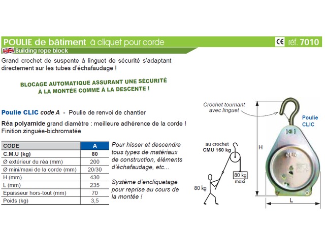 La poulie de bâtiment à corde SELM est conçue pour offrir une solution pratique et sécurisée aux professionnels du BTP. Cet outil facilite la manutention verticale des matériaux de construction et des éléments d'échafaudage, tout en assurant une sécurité maximale grâce à son système de blocage automatique. Construit en polyamide et acier zingué-bichromaté, ce produit promet une grande durabilité et fiabilité.