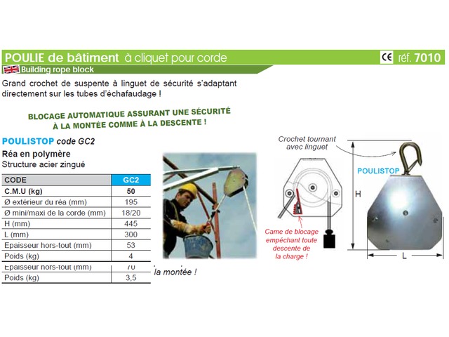 1. Sécurité accrue : Grâce à son mécanisme de blocage automatique, la poulie garantit une utilisation sans risque aussi bien en montée qu'en descente. Cela permet de prévenir les accidents sur les chantiers tout en renforçant la confiance des travailleurs.