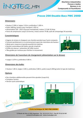 La presse à balles double bacs INO PMC200DB s'adapte parfaitement aux environnements industriels avec des contraintes d'espace. Sa capacité à compacter efficacement grâce à une force de compression pouvant atteindre 16 tonnes en fait un outil précieux pour le traitement de grandes quantités de matériaux. Dotée de fonctionnalités avancées comme l'éjection automatique des balles et une tête guidée par rouleaux, elle facilite grandement les opérations au quotidien.