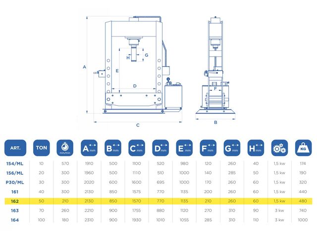Presse d'atelier motorisée OMCN 50 tonnes, modèle lourd.