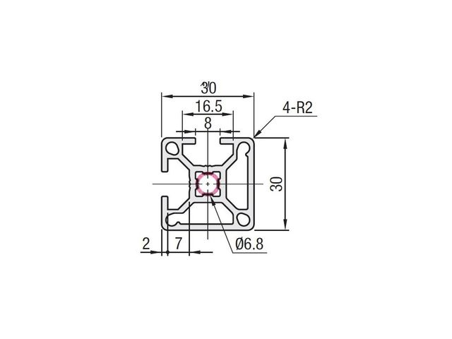 Matière : EN AW-6063-T5 Finition : Anodisé gris transparent Section : 30x30 mm Fentes : 2 fentes latérales de 8 mm Masse linéaire : 0,91 kg/m Moment d'inertie de section transversale (x10^4 mm^4) : 3,08 (axe x et y) Compatibilité Ø trou central : 6,8 mm Référence : 2C-AS-8-3030