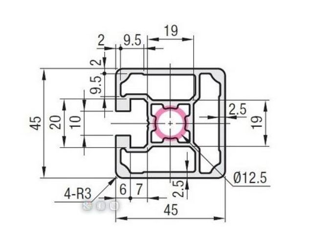 Section : 45x45 mm Fente : 10 mm Matière : EN AC-51400-T5 Finition : Anodisé gris transparent Masse linéaire : 1,82 Kg/m Moment d'inertie de section transversale (axe x) : 14,93 x 10^4 mm^4 Moment d'inertie de section transversale (axe y) : 15,27 x 10^4 mm^4 Compatibilité Ø trou central : 12,5 mm