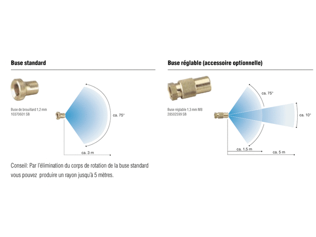 2. Flexibilité : L'appareil est équipé d'une buse standard de 1.2 mm qui peut être facilement substituée par une buse réglable de 1.3 mm disponible en option. Cette flexibilité offre une parfaite adaptation aux différents besoins du terrain. Que vous ayez besoin d'un jet concentré pour les plantations denses ou d'un brouillard plus volumineux pour les surfaces étendues, le Florajet répond à toutes vos exigences.