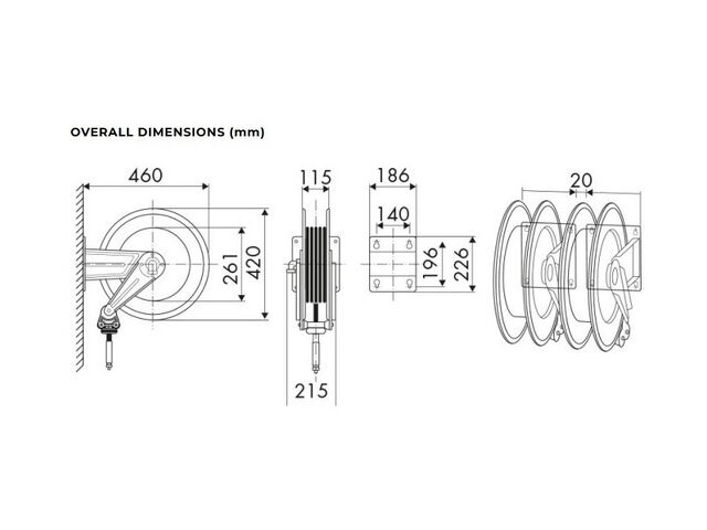 Enrouleur air et eau 15 m Ø G 1/2 (f) 20 bars Inox 304, ABS avec enroulement automatique et support mural fixe Raasm RA.9432.104