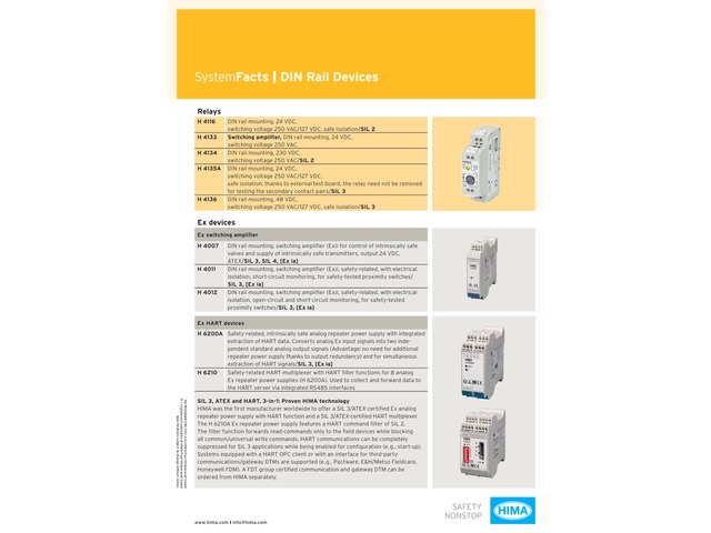 Montage : Rail DINTension de commutation : 250 VAC/127 VDCIsolation sûre : SIL 2Amplificateur de commutation : (Ex)i pour le contrôle de vannes à sécurité intrinsèque et alimentation de transmetteurs à sécurité intrinsèqueSortie : 24 VDC, ATEX/SIL 3, SIL 4, [Ex ia]Sécurité intrinsèque : alimentation répéteur analogique sûre avec extraction de données HART intégréeConversion des signaux : Convertit les signaux d'entrée analogiques Ex en deux signaux de sortie analogiques standard indépendantsExtraction simultanée des signaux : HART