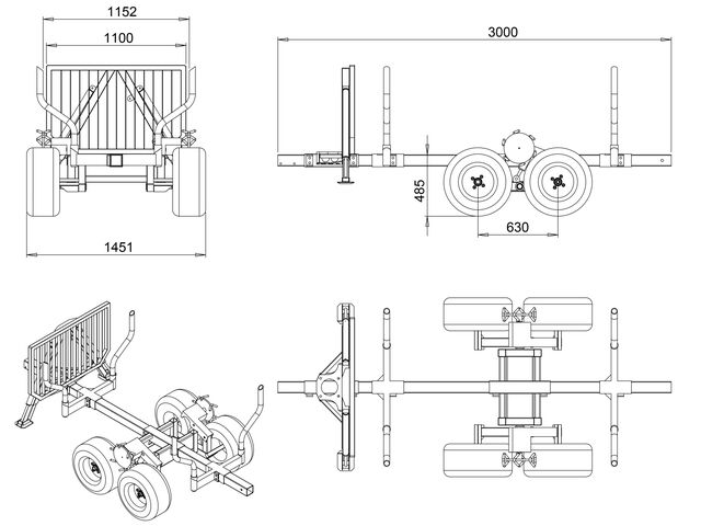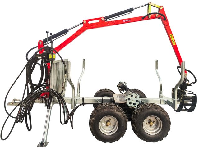 Remorque robuste pour le chargement et le transport de grumes et de bois. Livrée complète avec moteur d'entraînement et pompe, bras de grue hydraulique avec pince, rouleau de poussée et pieds de support.