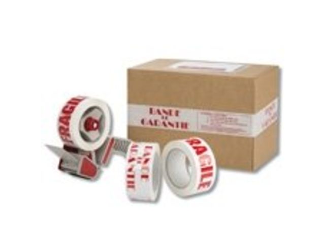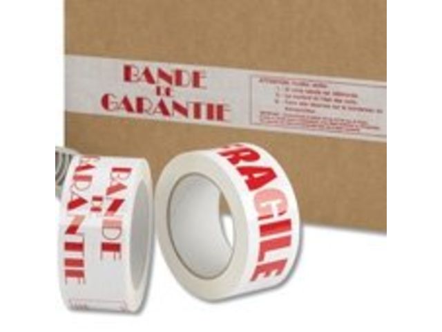 D’une longueur de 100 m et une laize de 50 mm, ce ruban adhésif est imprimé FRAGILE ou BANDE DE GARANTIE, en gros caractères rouge sur support blanc.