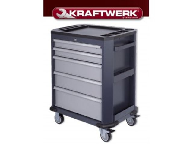 Servante Kraftwerk Junior Line à 5 tiroirs. Poignée intégrée, 2 roues fixes et 2 roues directionnelle avec frein, fermeture de la caisse par clés, espace de rangement latéral.