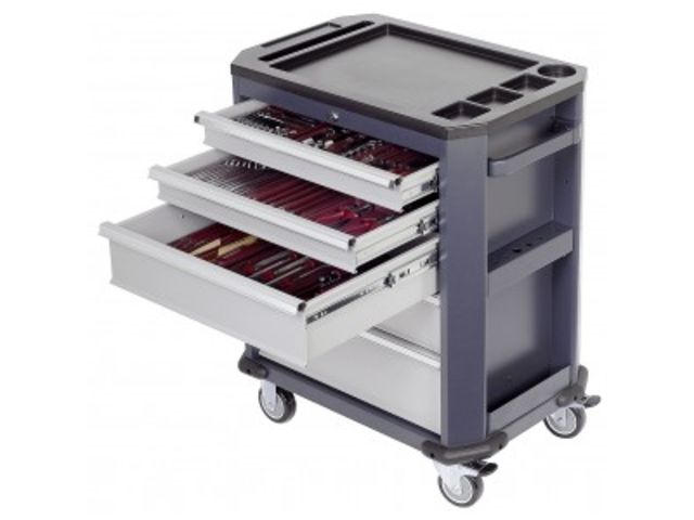 Servante 5 tiroirs avec composition d'outils 1/4" & 1/2", clés mixtes, pinces, limes, scie et outils de frappe.