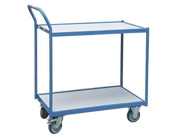 Servante établi 2 plateaux bois médium – capacité 500 kgCette servante établi 2 plateaux est l’équipement idéal pour les ateliers, garages et environnements industriels. Véritable établi mobile, elle peut supporter une charge maximale de 500 kg, offrant une solution à la fois pratique pour la manutention et le rangement.Sa structure en acier mécano-soudé avec barre de renfort sous plateau et tubes carrés de 40 x 40 mm garantit une solidité exceptionnelle.Plateaux en bois médium Chaque servante est équipée de 2 plateaux en bois médium de 16 mm d’épaisseur, encastrés dans le châssis pour une meilleure protection contre les chocs. Pas de fissures, d’éclats ni d’échardes Disponible en 2 dimensions : 1060 x 680 mm ou 1300 x 800 mmCes plateaux offrent une grande surface de travail et assurent un transport sécurisé des charges lourdes ou encombrantes.Ergonomie et confort d’utilisation Elle dispose d’une poignée de poussée horizontale en tube mécano-soudé de Ø 28 mm, placée à une hauteur ergonomique de 930 à 945 mm, permettant de limiter les TMS (troubles musculosquelettiques) et de faciliter la manœuvre, même avec des charges dépassant du plateau.Roues haute qualité conformes aux normes EN 1757 Montée sur 4 roues Ø 200 mm avec roulement à billes étanche : 2 roues fixes à l’avant 2 roues pivotantes avec frein à l’arrièreLe bandage TPE (élastomère thermoplastique) assure un roulage silencieux, sans traces et absorbant les vibrations, tout en réduisant l’effort au démarrage.Une fabrication française de qualité Peinture époxy bleu RAL 5007, résistante aux rayures Servante livrée montée et prête à l’emploi Un vrai gain de temps pour les professionnels qui recherchent un équipement fiable et durableCaractéristiques techniques– servante établi 2 plateaux Charge maximale : 500 kg Nombre de plateaux : 2 Dimensions au choix : 1060 x 680 mm ou 1300 x 800 mm Matière des plateaux : bois médium 16 mm Distance utile entre plateaux : 630 mm Structure : acier mécano-soudé avec barre de renfort Finition : peinture époxy bleu RAL 5007 Poignée : Ø 28 mm mécano-soudée, hauteur 930/945 mm Roues : Ø 200 mm, bandage TPE, 2 fixes + 2 pivotantes avec frein Norme : EN 1757Fabrication : 100 % française
