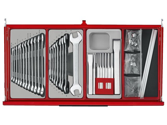 Tous les outils sont rangés dans des plateaux séparés, reliés entre eux par un système en queue d'aronde, et s'adaptant dans les tiroirs de votre coffre ou servante à outils. Pas d'espace perdu, chaque pièce est parfaitement à sa place. Un coup d'oeil suffit pour voir s'il manque un outil.