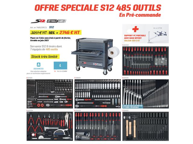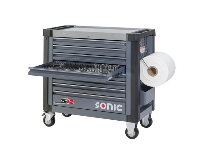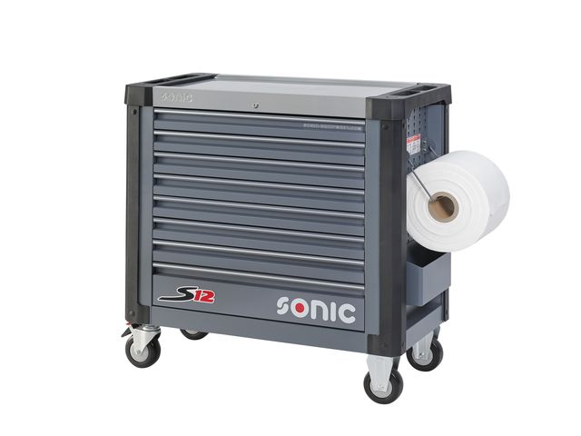 La servante Sonic S12 est la nouvelle version de la Jumbo : nouvelle couleur, plan de travail en inox, supports d'outils latéraux. Outil de travail performant alliant robustesse et design, la servante S12 est le modèle phare de la gamme. Elle est disponible en gris et en version équipée.