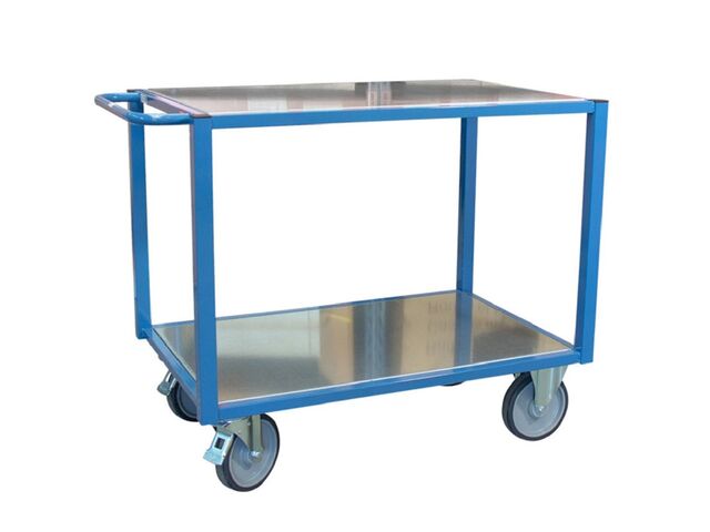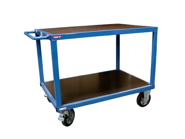 Servante établi plateaux bois pour charge lourde. Charge 1000 kg Indispensable en manutention, cette servante établi est à la fois robuste, ergonomique et durable. Véritable poste de travail mobile, elle peut supporter jusqu’à 1000 kg de charge.Son châssis en acier mécano-soudé, renforcé par des tubes carrés sous les plateaux, garantit une résistance et une longévité exceptionnelles. Les plateaux en bois Glissnot, encastrés dans le châssis, sont protégés des chocs. D’une épaisseur de 18 mm, ils sont antidérapants, imputrescibles et très résistants.Cette servante est équipée d’une poignée de poussée horizontale en tube Ø 28 mm mécano-soudé, assurant une excellente prise en main. Ce type de poignée permet également de manipuler des charges débordantes. Pour une ergonomie optimale et afin de réduire les risques de TMS, la hauteur de poussée est fixée à 970 mm.Le modèle est monté sur 4 roues en caoutchouc Ø 200 mm, conçues pour les charges lourdes, avec corps en aluminium et roulements à billes : 2 roues fixes ; 2 roues pivotantes avec freins. Caractéristiques Charge max (kg) : 1000 Nombre de plateaux (mm) : 2 Type : servante établi Diamètre tube poignée (mm) : Ø28 Couleur : bleu RAL 5007 Structure : acier Finition : peinture époxy Dim. plateaux (mm) : 1200 x 800 Epaisseur plateaux (mm) : 18 Distance utile entre plateaux (mm) : 630 Matière roues : caoutchoucDécouvrez aussi nos modèles complémentaires : chariots de magasins, chariots d’ateliers, et chariots charges lourdes.